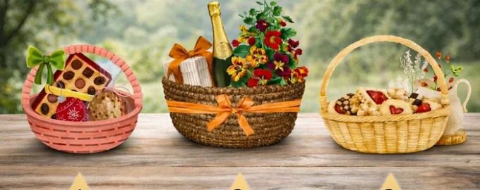 Představte si, že dnes máte narozeniny nebo jiný významný svátek. Zamyslete se nad obrázky tří košů a popřemýšlejte, který z nich byste chtěli dostat jako dárek. Zvažte nejen obsah, ale také tvar a barvu samotného koše.