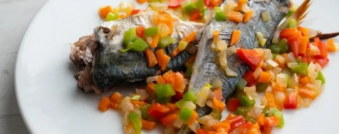 Makrela je dokonale zkombinovaná se zeleninou a pikantním dresinkem ze zakysané smetany, tvrdého sýra, sójové omáčky a koření. Pokrm je křehký, chutný a hodí se k rodinné večeři i na slavnostní stůl.