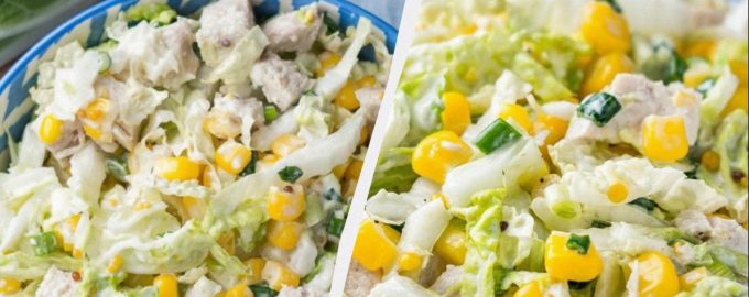 Snadno stravitelný salát se zelím, kuřecím masem a kukuřicí je snadný na přípravu.