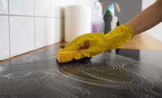 Roztok naneste na znečištěný povrch houbou a věnujte zvláštní pozornost problematickým místům. Složky budou potřebovat čtvrt hodiny, aby pronikly do struktury plaku a změkčily ho. Pro zvýšení účinku je nutné ošetřená místa posypat jedlou sodou. Její abrazivní vlastnosti pomohou mechanicky odstranit změklý tuk a dodají lesk.